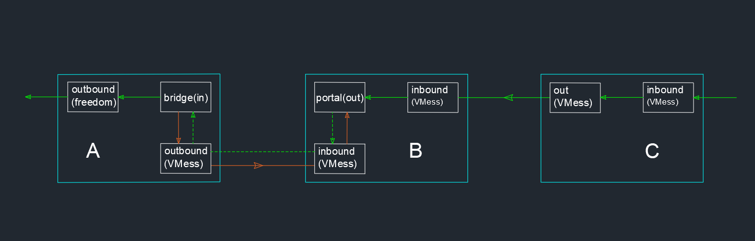 Tips: 在 B 的配置中,可以使用同一个 VMess inbound 来接受 A 和 C 的请求来简化配置。